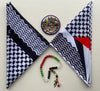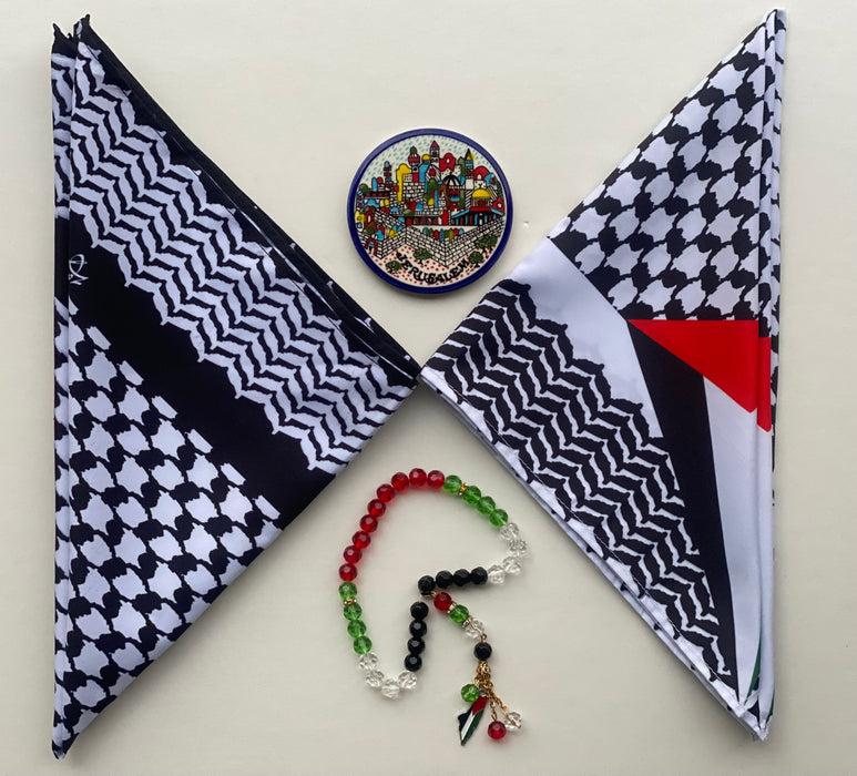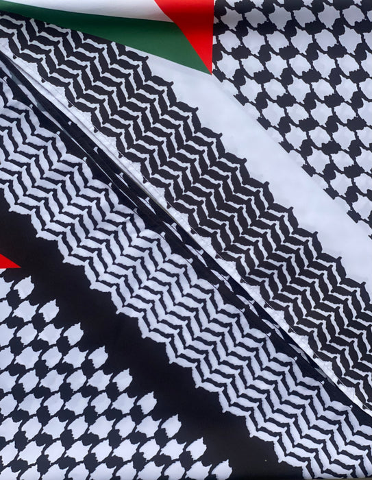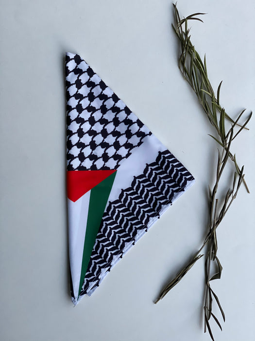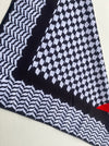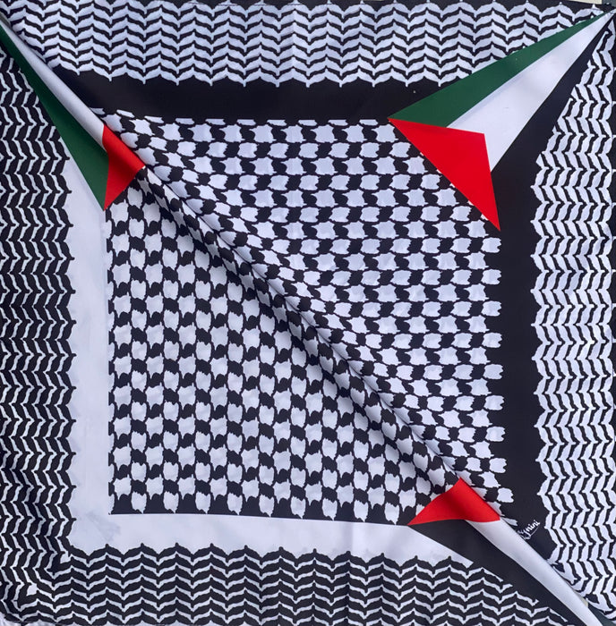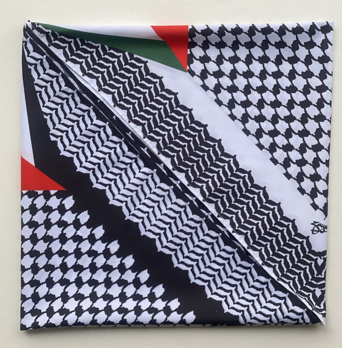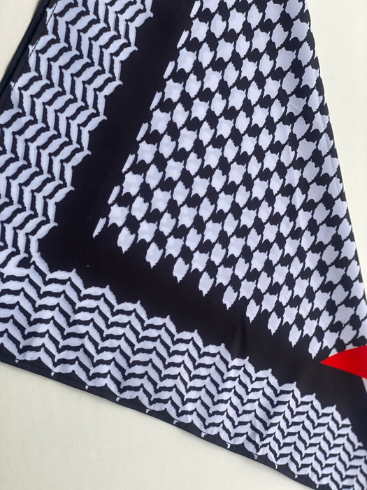 This square 22"x22" Kuffiyeh-print scarf is a hip and fashionable way to represent and showcase your identity. This scarf is multi-functional and can be worn around the head, face, neck, or even as an accessory. Different ways of folding the scarf will yield different looks.